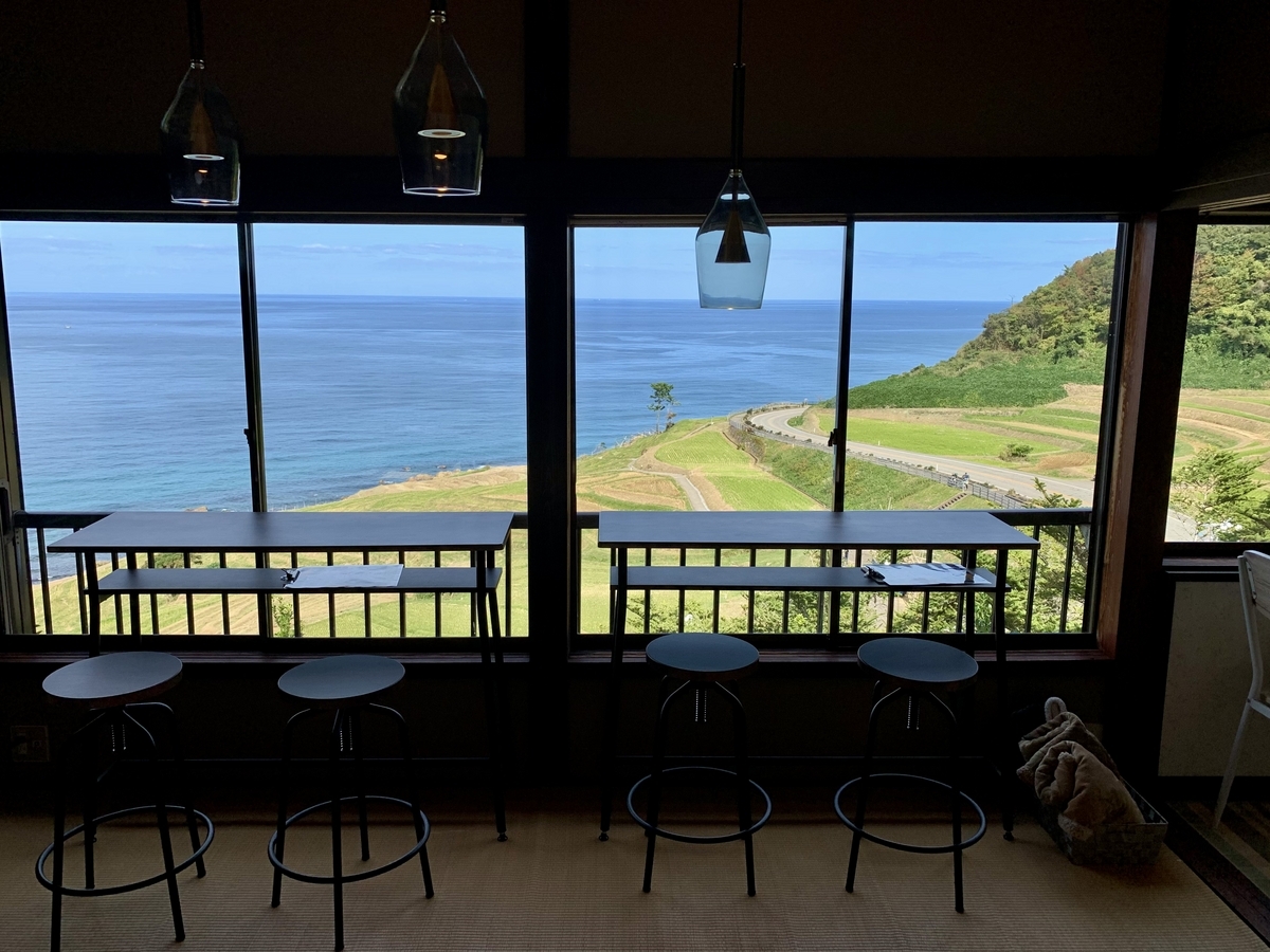 絶景カフェ。お店の名前の通り、千枚田と名前のついた棚田が目の前に広がる。そして棚田の先に広がるのは日本海。次にくるときには、夕方と夜の絶景を堪能したい。