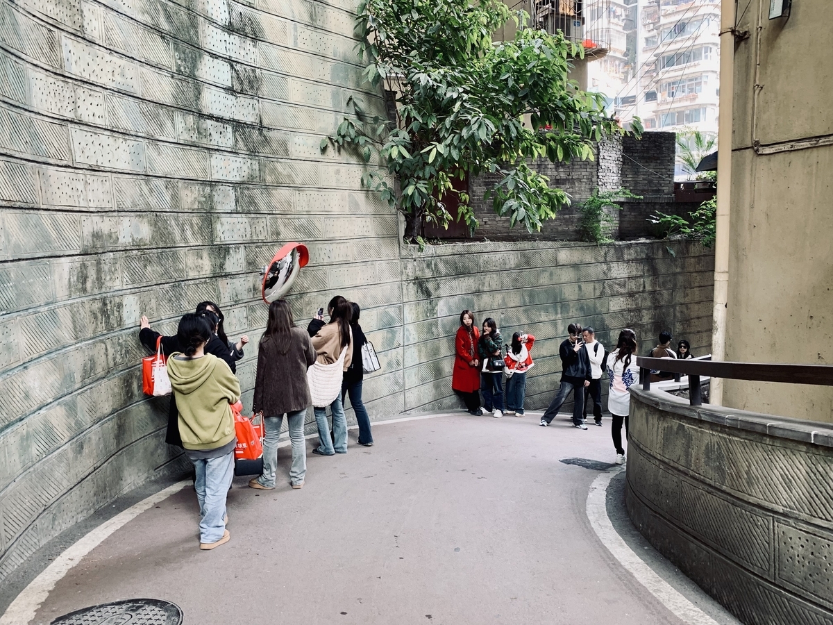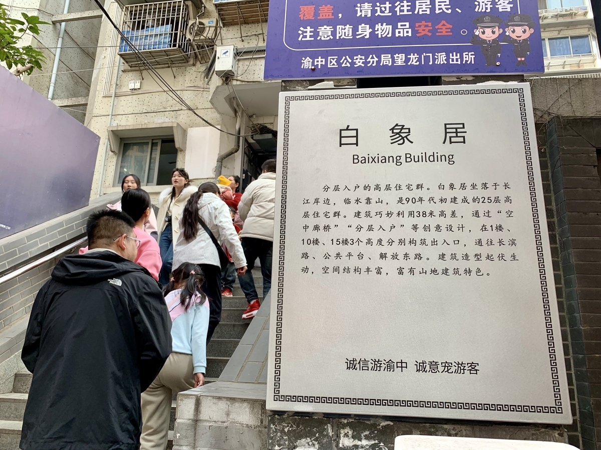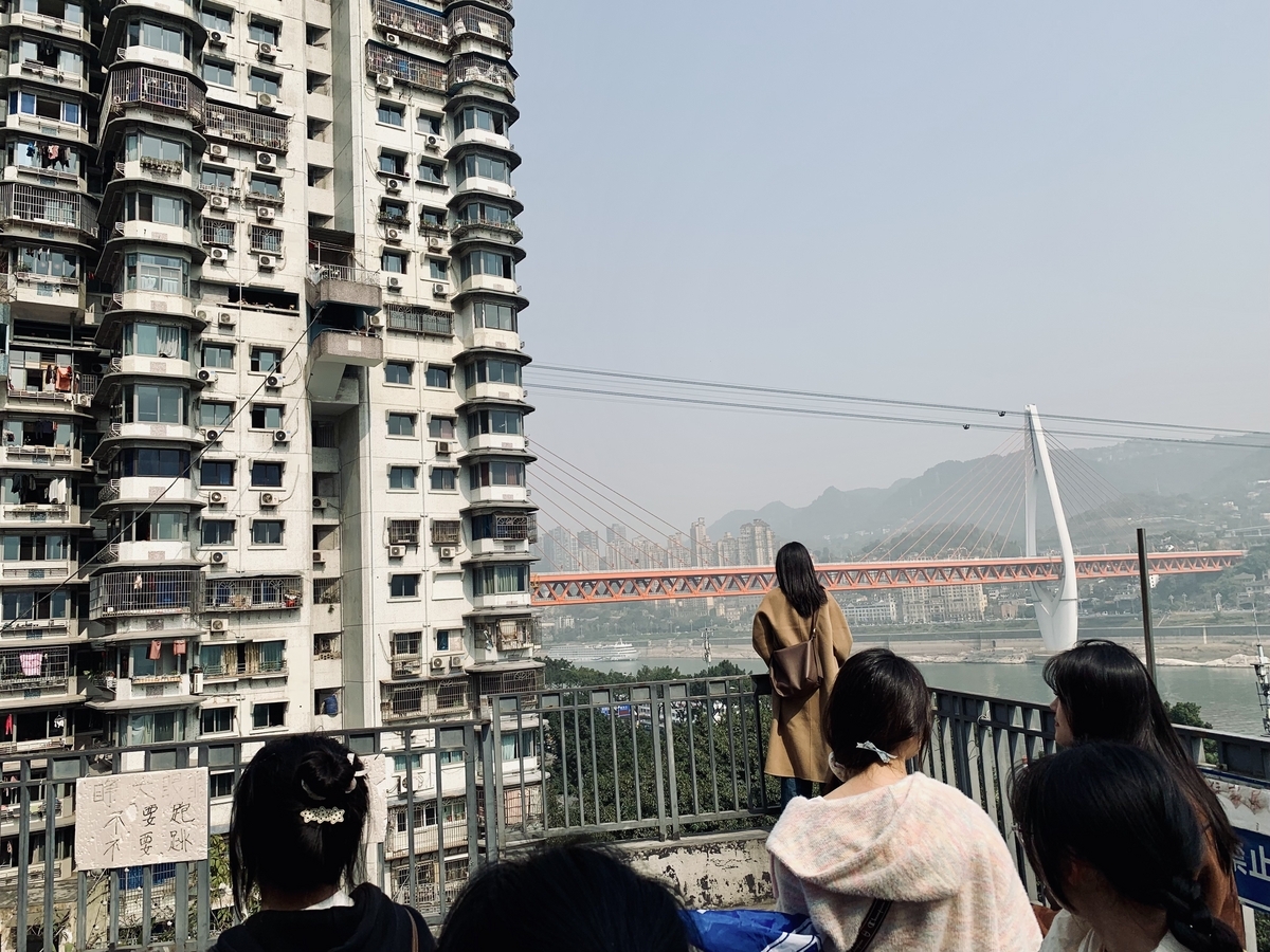 下は写真待ちの列。写真に関してはベストショットを撮りたいのはみんな一緒だからか、若者だからかはわからないけれど、割り込むことなくおとなしく順番に並ぶ。後ろ姿で白象居マンションと長江と橋を入れて撮るのがワンホンショットらしい。みんな同じ構図の同じポーズ。